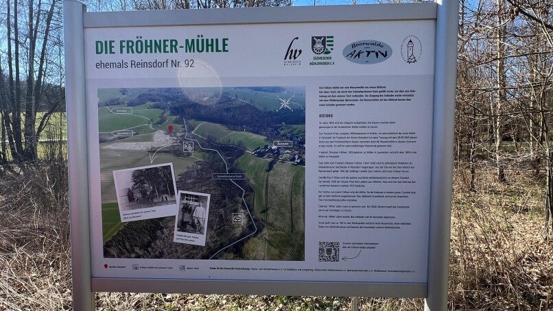 Von hier folgt man einem Feldweg in Richtung Beerwalde. Vor der Brücke über den Schweikershainer Bach erreichen Sie rechterhand eine Infotafel zur Fröhner Mühle. Nur etwa 100 m weiter lassen sich die Reste der historischen Mühle und der Mühlteiche entdecken – ein besonderes Highlight der Tour.